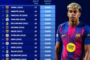体育资讯10月29日讯 德转盘点了历史上身价最高的30名球员,历史上共有四名球员达到过2亿欧元里程碑,分别是亚马尔(2025年,17岁)、姆巴佩(2018年,19岁)、维尼修斯(2024年,24岁)和哈兰德(2024年,24岁)。