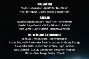 中前场:塔哈-阿里(马尔默)、阿亚里(布莱顿)、巴德吉(巴萨)、贝里瓦尔(热刺)、伯恩哈德森(荷尔斯泰因基尔)、伊兰加(纽卡)、伊萨克(利物浦)、卡尔斯特罗姆(乌迪内斯)、雨果-拉尔森(法兰克福)、利德伯格(达姆施塔特)、伦德格伦(加尔斯)、本杰明-尼格伦(凯尔特人)、斯万伯格(沃尔夫斯堡)、泽尼利(埃弗斯堡)